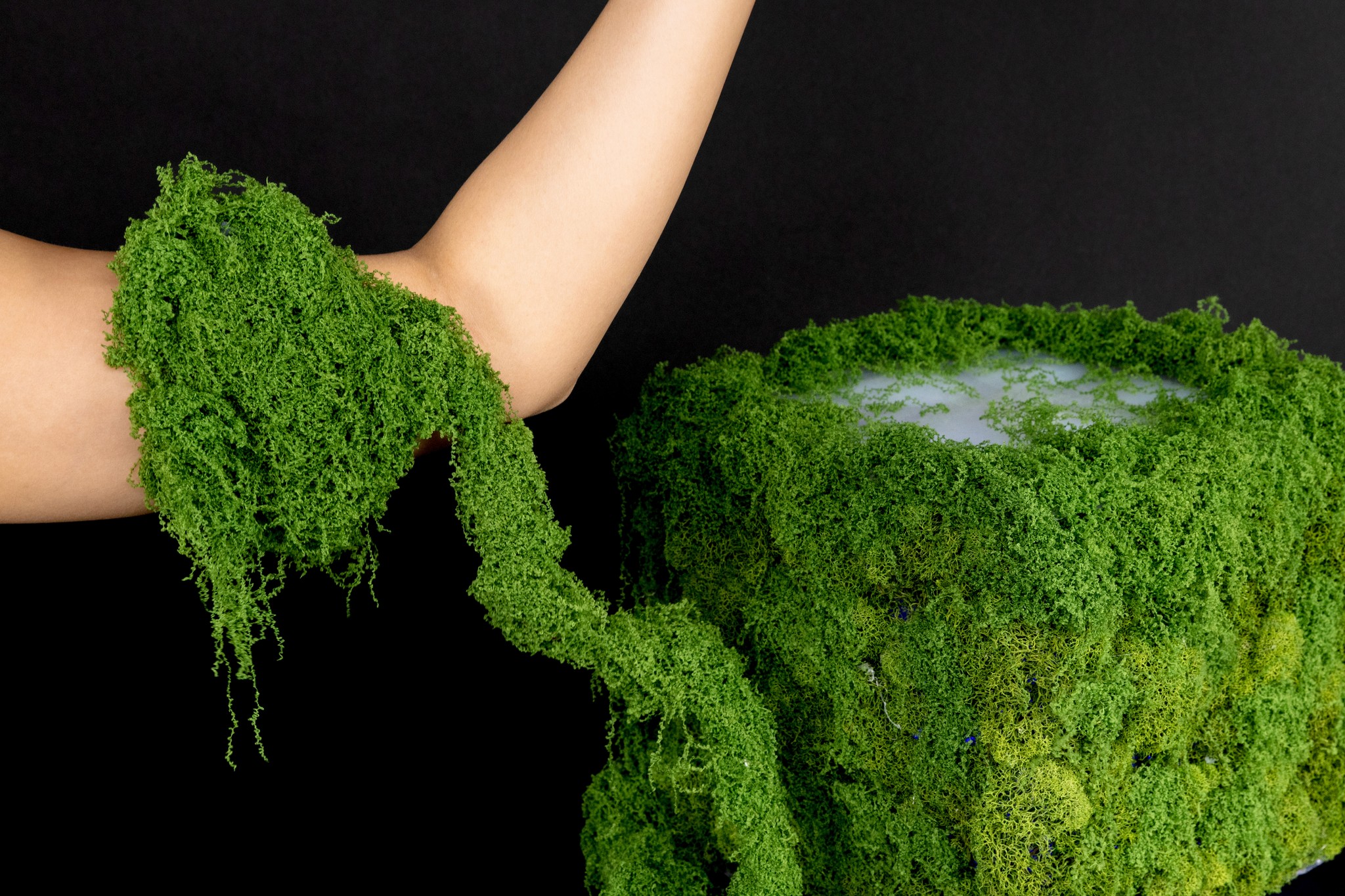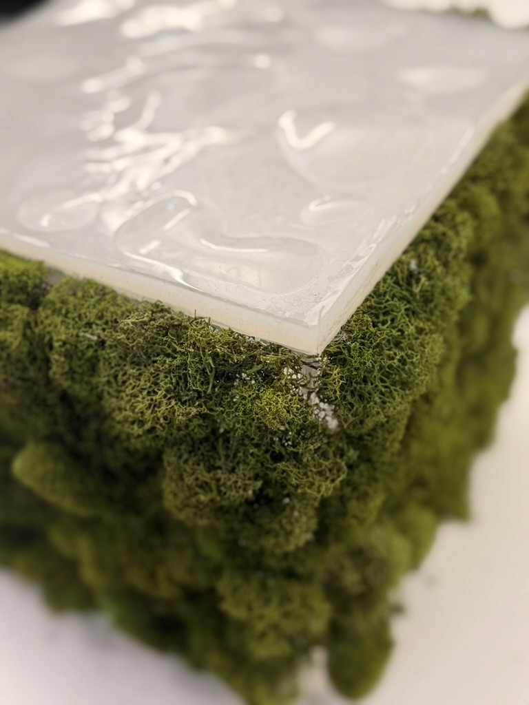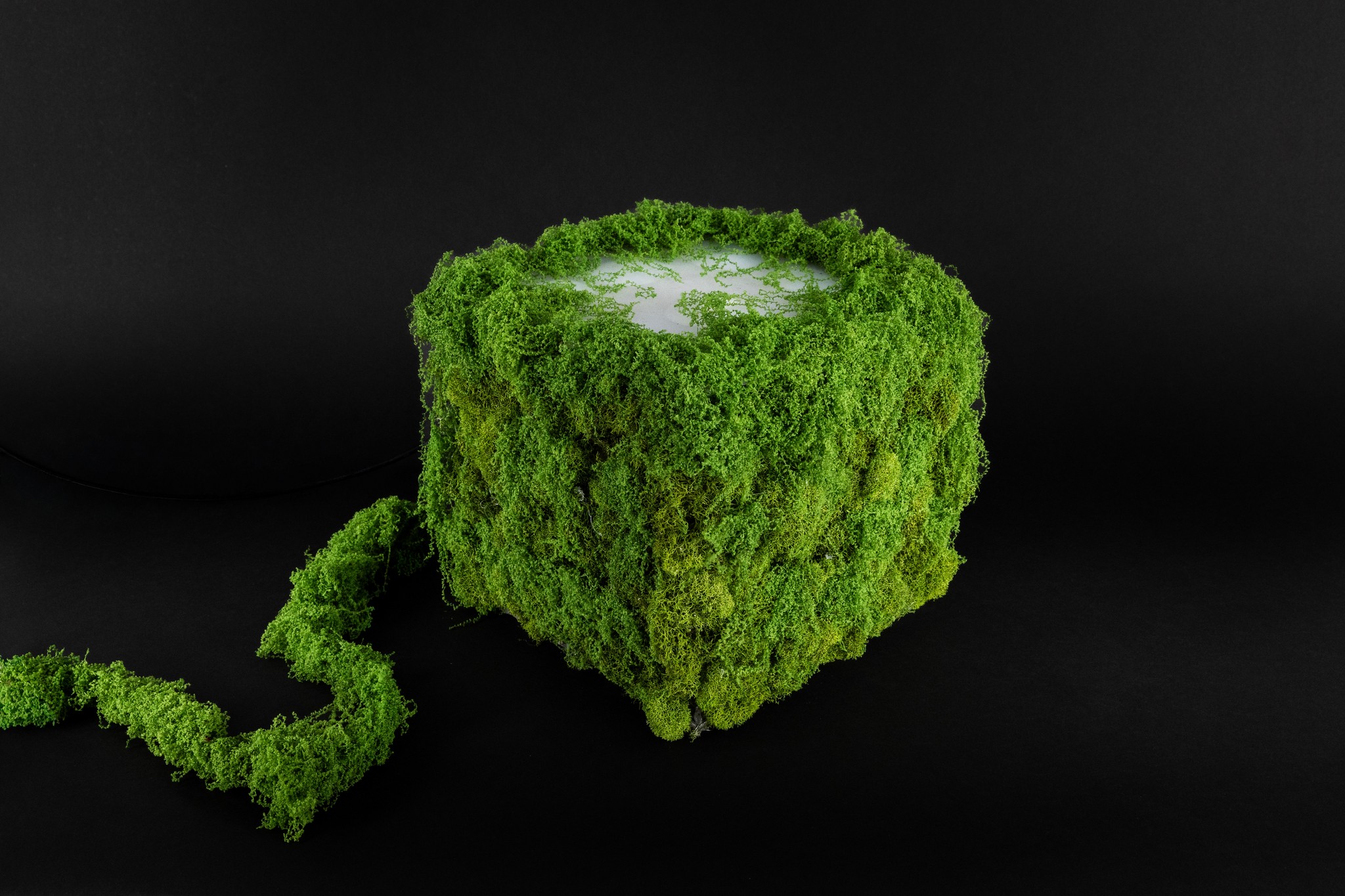 We covered the cube in a mixture of real and preserved moss, letting the seams disappear into something that feels grown rather than made. What started as a structure became a small, breathing landscape.