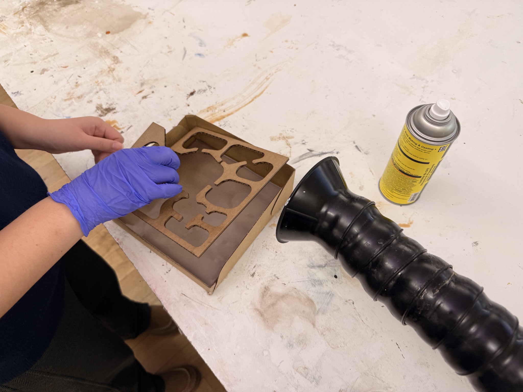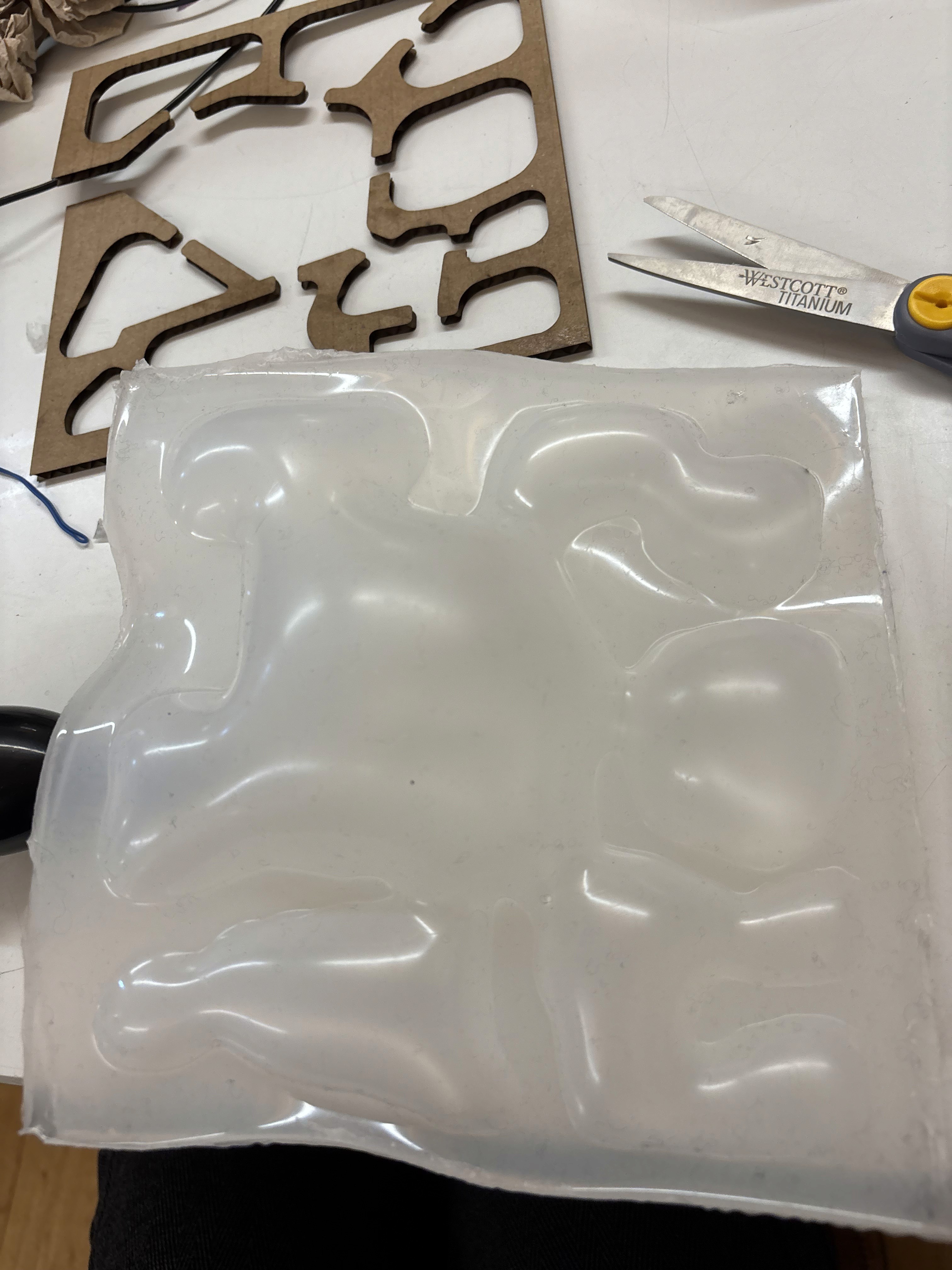 Using the mold design (pictured below), we decided to use cardboard and use the 2-part stencil mold casting method to create a one sided silicone actuator.