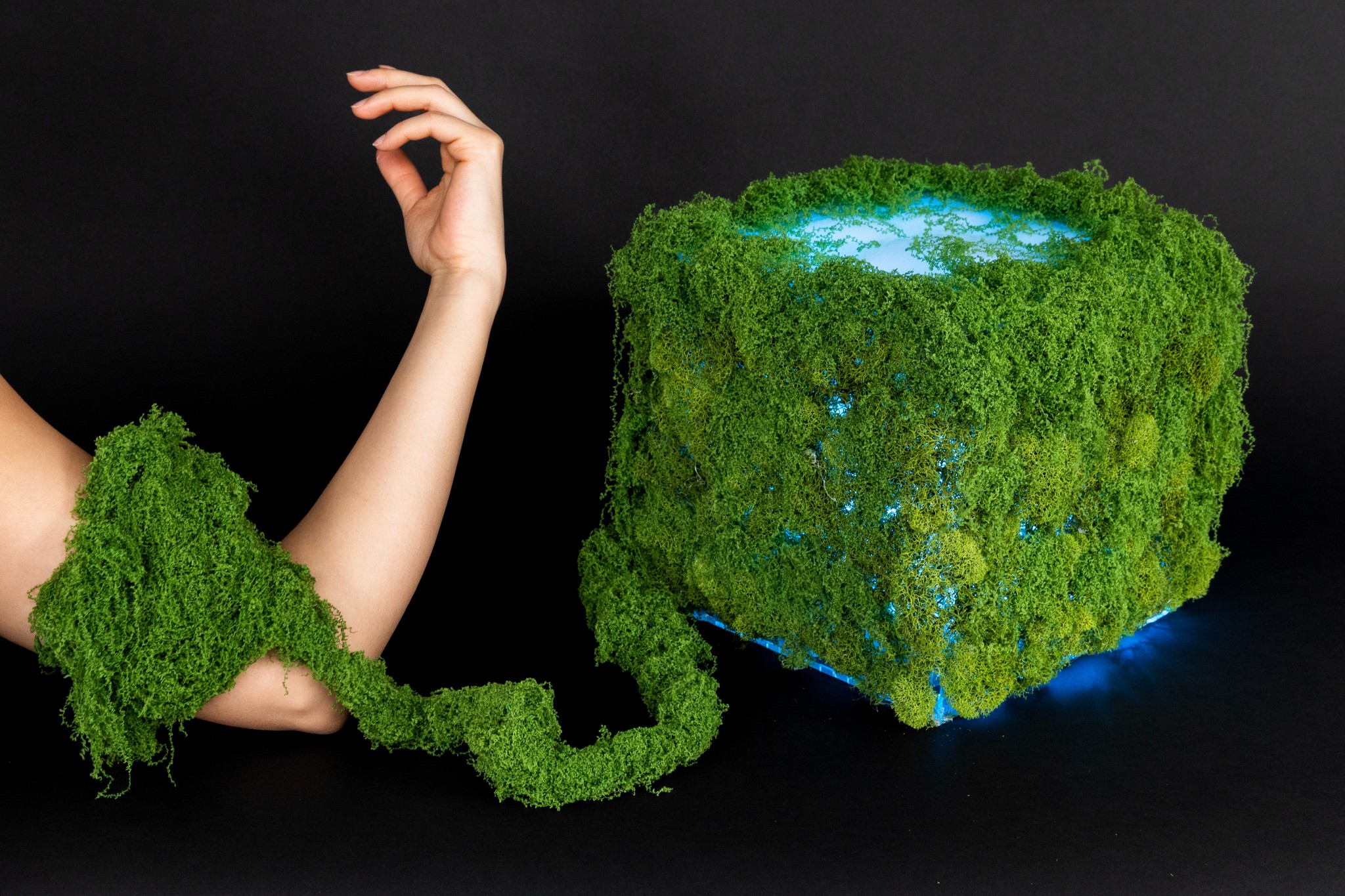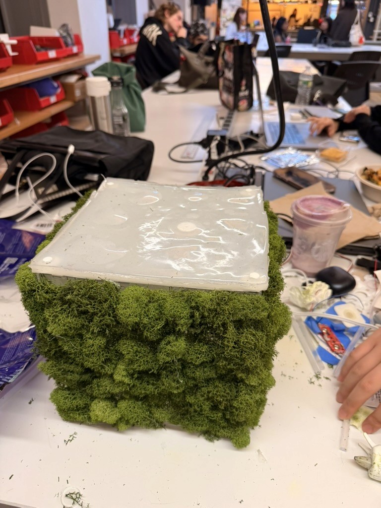 The cube listens to the intensity of your muscle, and breathes with you. As you flex, it inhales. As you hold, it strains. The lights flicker softly at first, then more urgently, mirroring a stress you may not have realized you were holding. In its quiet, breathing form, the cube becomes a small living witness – a reminder that nature is not separate from us, but always responding, always entangled with the rhythms of our bodies.
