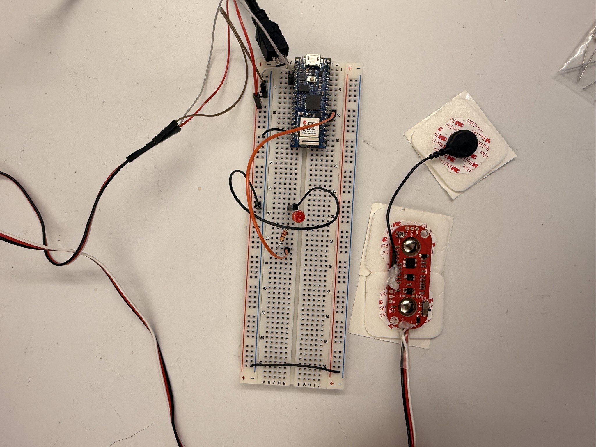 The MyoWare sensor reads the electrical activity produced by your muscles (known as electromyography, or EMG). When you flex, your muscle fibers fire tiny electrical signals. The sensor picks these up through electrode pads placed on the skin, amplifies them, and outputs an analog voltage that corresponds to how hard you're contracting.