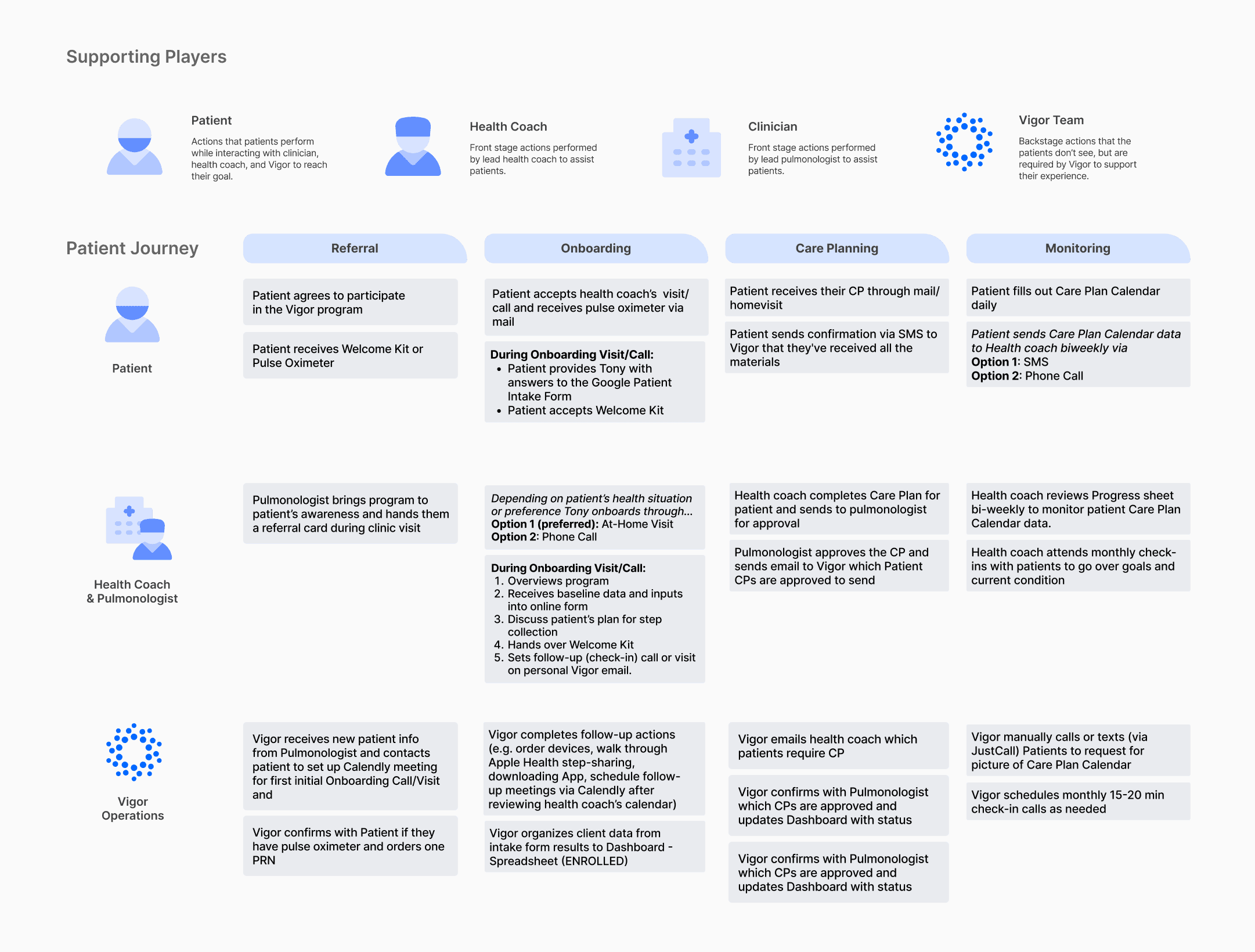 I mapped the full patient journey to surface where communication was breaking down across patients, health coaches, pulmonologists, and the Vigor operations team.