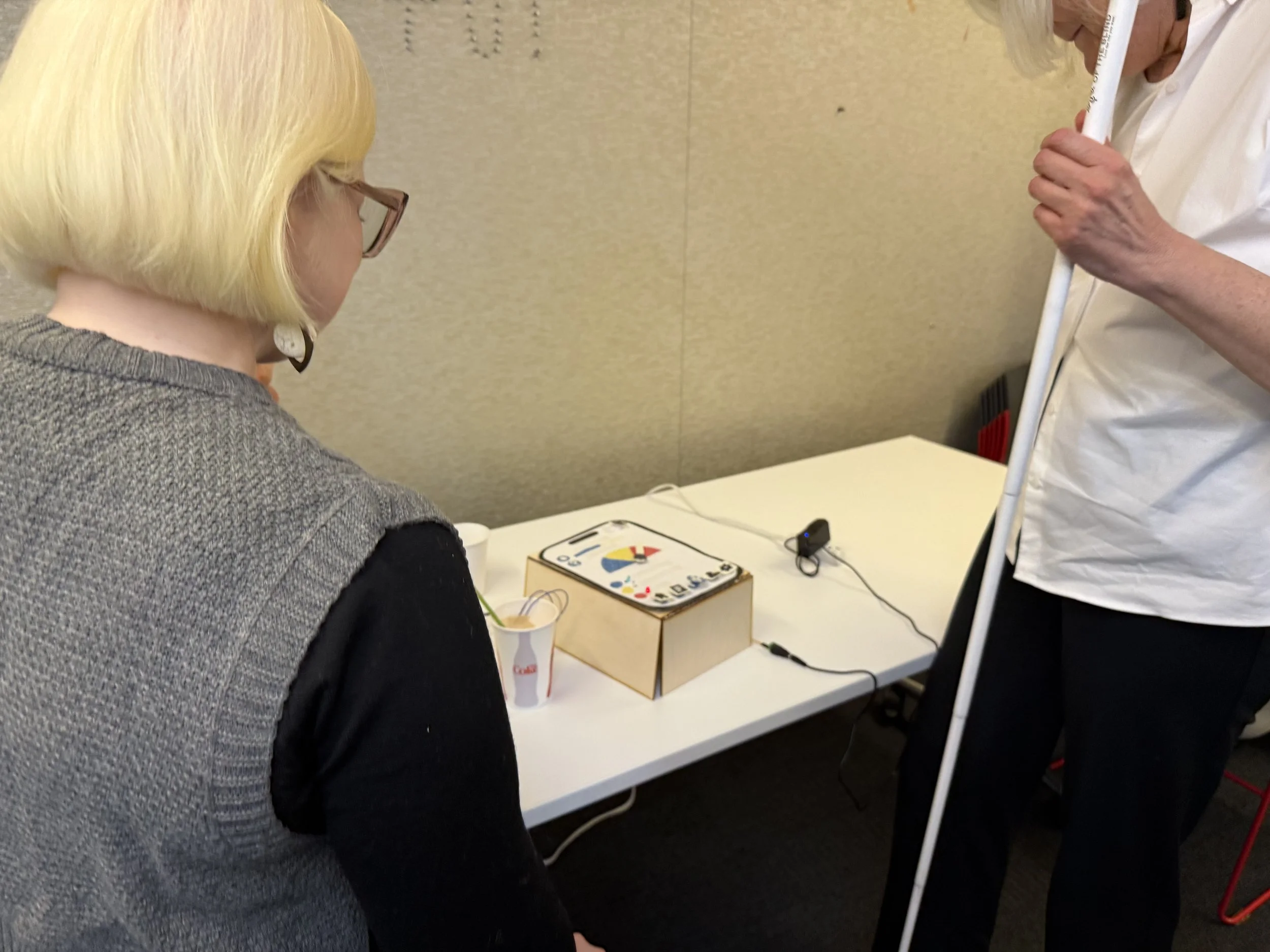 Professors Georgina Kleege (UC Berkeley) and Sugandha Gupta (Parsons), both with low vision, attended our final presentation and engaged with our prototype.