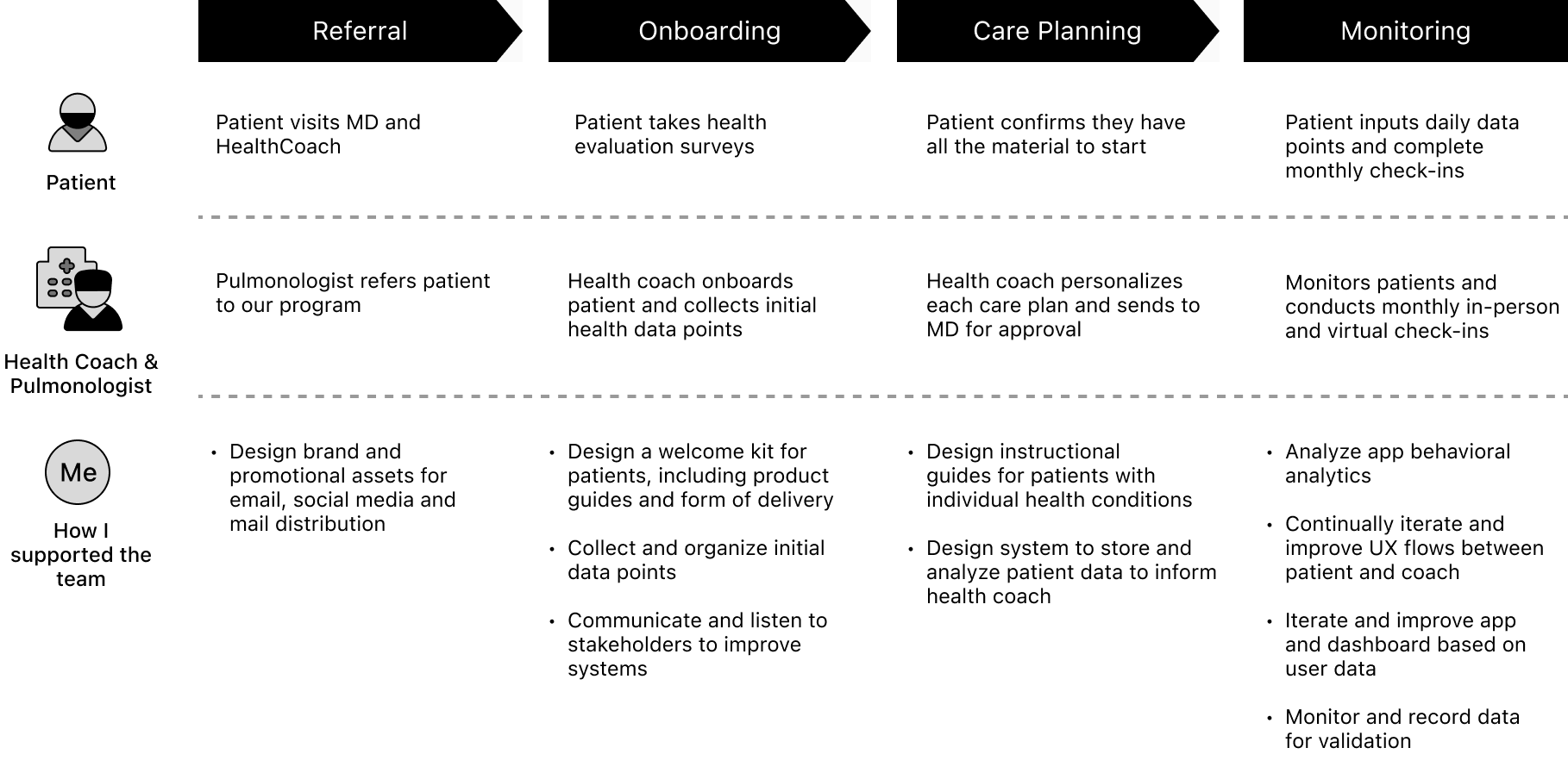 To address this, I mapped the full patient journey and designed a clearer communication flow between patients, health coaches, and pulmonologists. This helped the team see where support was breaking down and how we could make care feel more connected, both for patients and for the people guiding them.